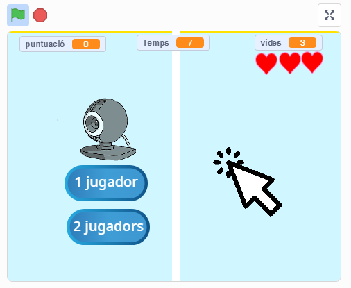 Recordeu d’apretar sempre la bandereta verda, un parell de vegades, per reiniciar el joc per complert i d’acceptar els permisos de la web cam al navegador si escolliu la opció de jugar-hi amb la web cam.
