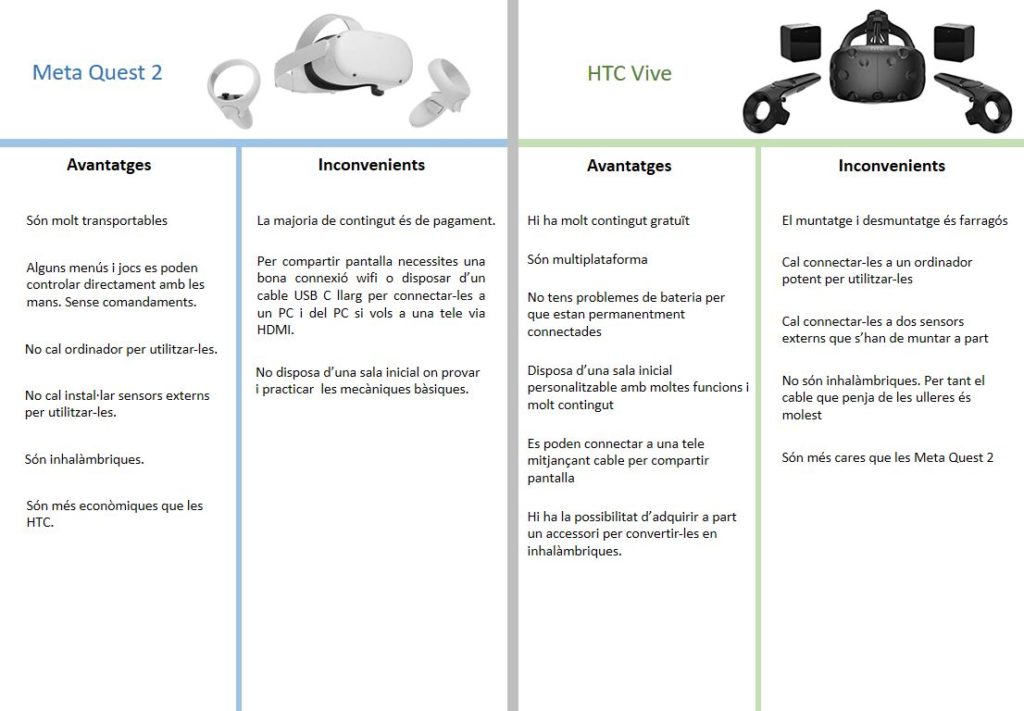 La primera és que tan si utilitzeu les Meta Quest 2 o les HTC Vive, en ambdós casos, una barrera important que us trobareu són els comandaments que utilitzen les dos ulleres. Aquests són poc intuïtius, amb molts botons i complicats d’utilitzar i a moltes de les persones amb les que treballem els costa utilitzar-los ja que apreten altres botons sense voler que els fa sortir al menú, etc.