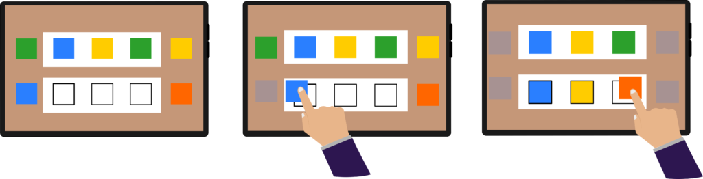 se’ns presenta una seqüència de 3 colors que haurem d’intentar reproduir arrossegant els colors que ens trobarem pel voltant cap als quadrats blancs que trobem sota la seqüència de mostra. Sempre hi haurà un color més dels necessaris.