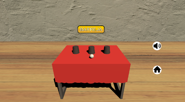 Es tracta del clàssic joc de trilers en el que disposem de 3 gots. En un d’ells s’amaga una piloteta i mitjançant un conjunt de moviments es barregen els tres gots.