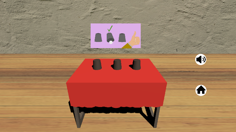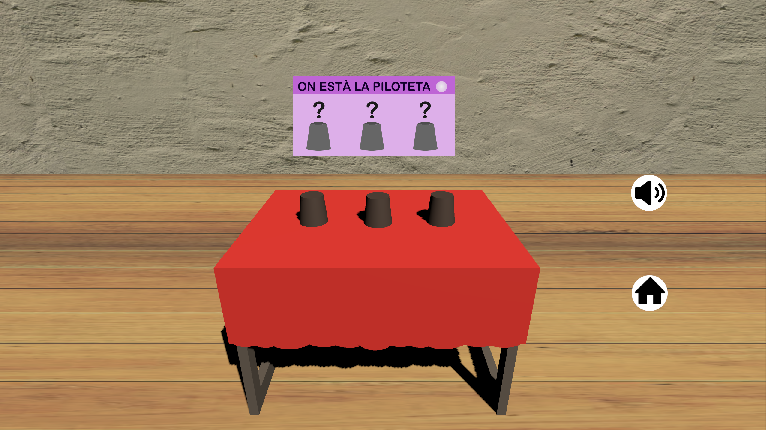 En aquest moment la persona haurà de clicar el got que cregui que conté la piloteta, amb el dit si està jugant des d’una tauleta android o amb el ratolí si està jugant des de l’ordinador. En cas de fallar sentireu un audio dient “no és aquest” mentre que si encerteu apareixerà un altre cartell: