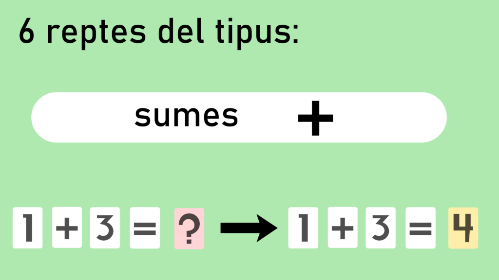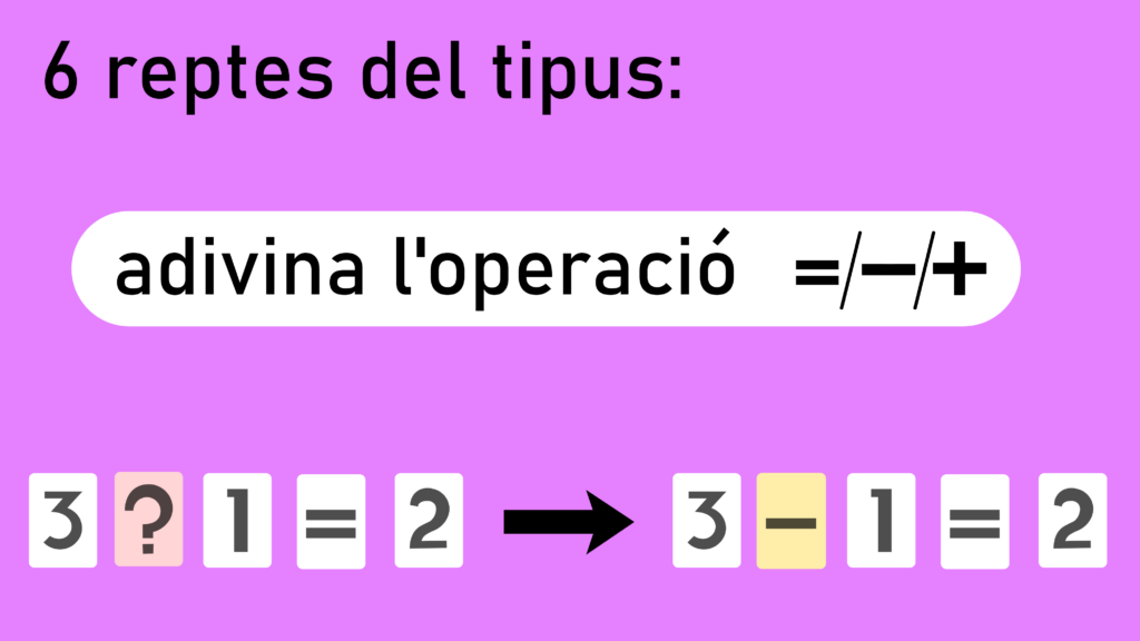 Finalment en els 6 últims reptes haurem de col·locar els signes de resta. suma o igual on toqui per tal que les operacions tinguin sentit: