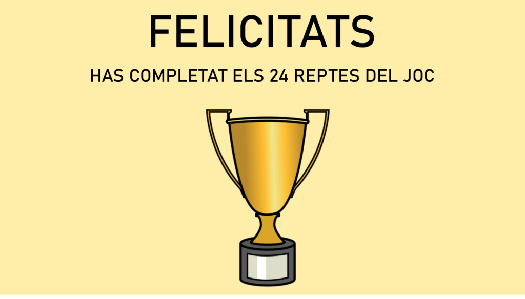 En completar els 24 reptes existents el joc s’acabarà i us ho farà saber amb aquesta cartell: