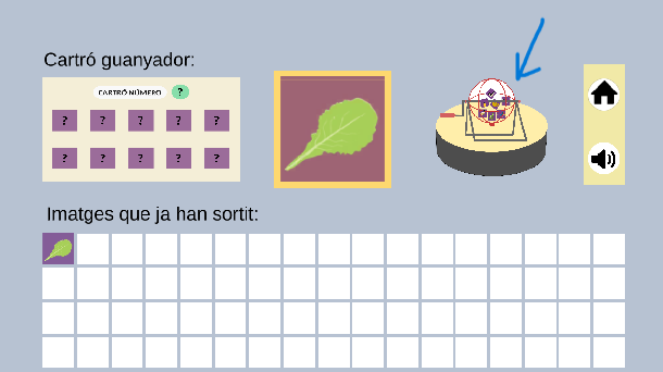 A banda de la imatge a la part central el joc també ofereix un reforç sonor que anirà dient en veu alta quin dibuix acaba de sortir. Si per algun motiu no voleu aquest reforç verbal es pot anul·lar en qualsevol moment prement el botó de l’altaveu que trobareu a la part superior dreta, just a sota del botó de la caseta que és per anar al menú:
