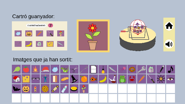 En el moment que un dels 11 cartrons disponibles estigui completat el joc t’avisarà col·locant una imatge del cartró completat a la part superior esquerra i també ho notificarà amb veu. De fet cada vegada que es completi un cartró el joc mostrarà la imatge i ho notificarà per tal que la persona no es despisti: