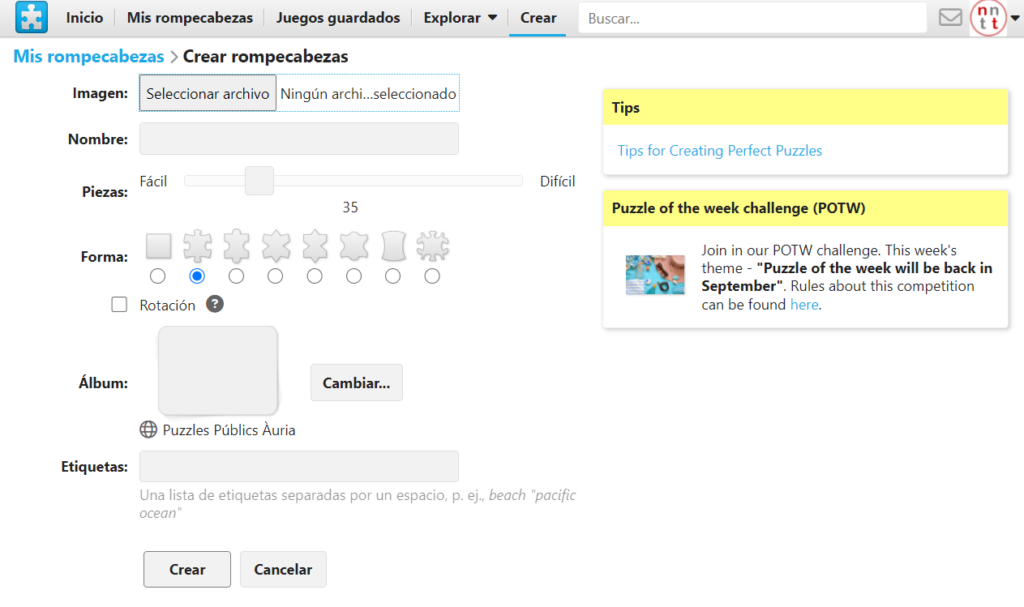 Un cop estiguem registrats haurem d’accedir a l’apartat “crear” del menú superior i començar a confirgurar el nostre puzzle: