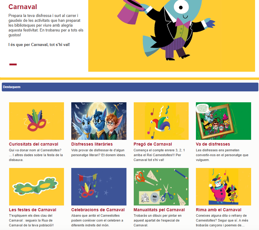 Per acabar us deixem amb us deixem amb la secció de carnaval de la biblioteca virtual on trobareu informació i propostes sobre aquesta festa:
