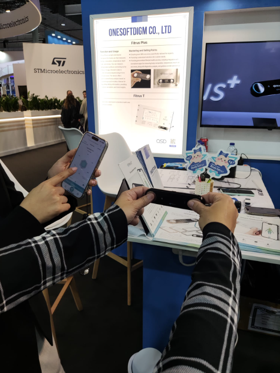 En aquesta imatge es pot veure com estem provant en primera persona un petit dispositiu connectat al mòbil que et permet mesurar de forma quasi instantània i només tocant amb els dit polzes de les dues mans, algunes constants vitals com ritme cardiac, pressió, saturació en sang, nivell de proteïnes, etc.