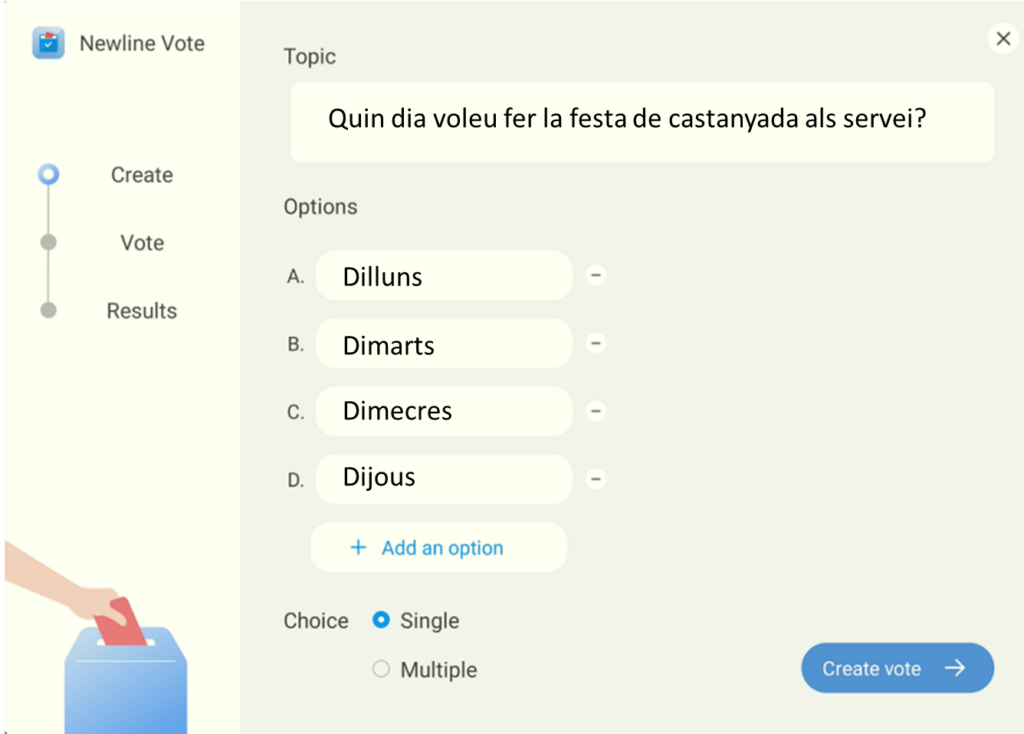 Es tracta de l’app “votació” una app que ens permetrà crear de forma ràpida i senzilla votacions que la gent podrà respondre amb els telèfons a través d’un QR, de forma anònima.
