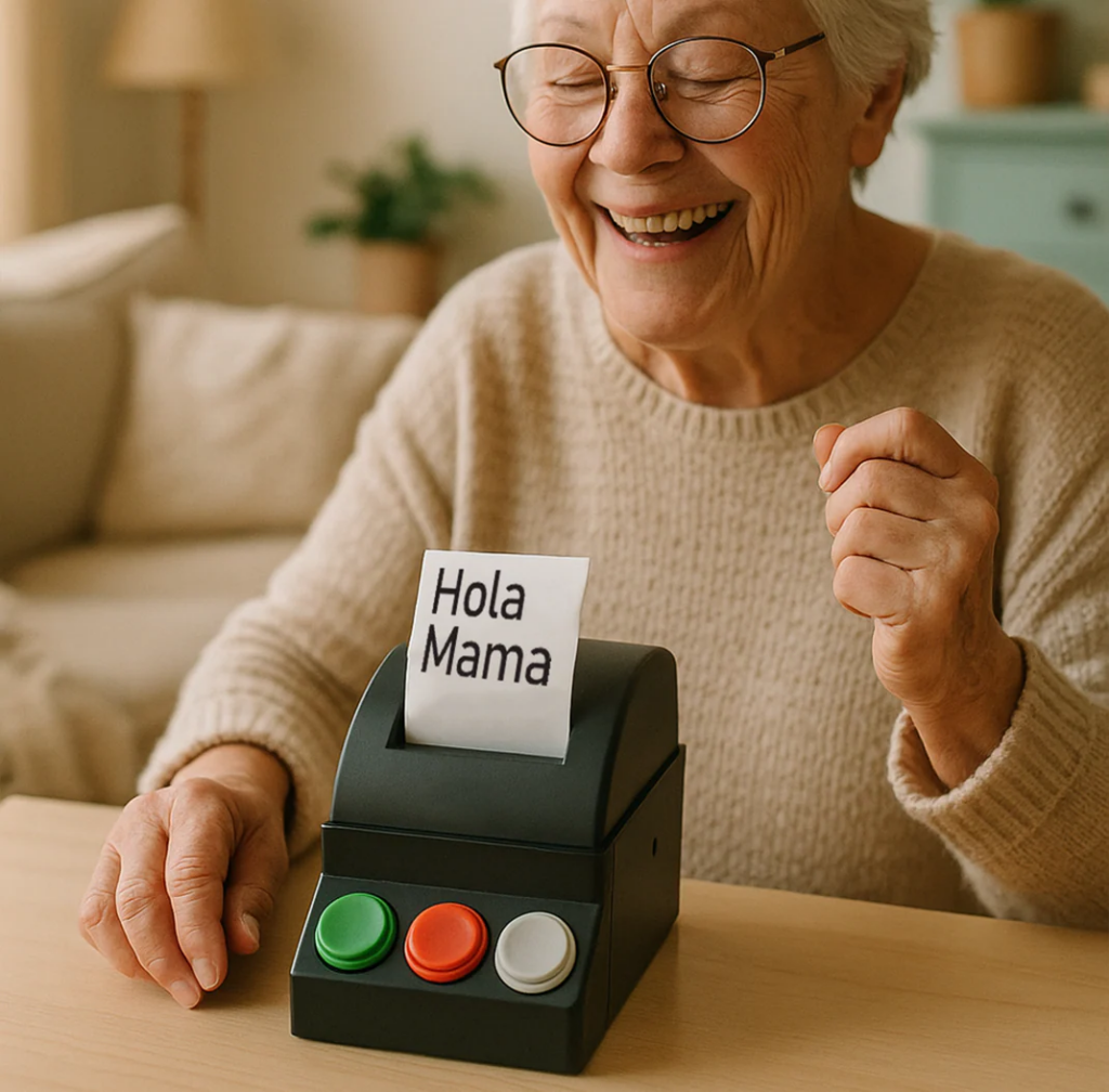 La família comparteix un grup de Telegram connectat amb la impressora Heralto. En aquest grup, tothom pot enviar missatges o fins i tot fotografies, que s’imprimeixen instantàniament a casa de l’usuari que té instal·lada la impressora. Mitjançant tres botons que es poden configurar prèviament amb unes respostes predeterminades, l’usuari pot contestar els missatges dels seus familiars.