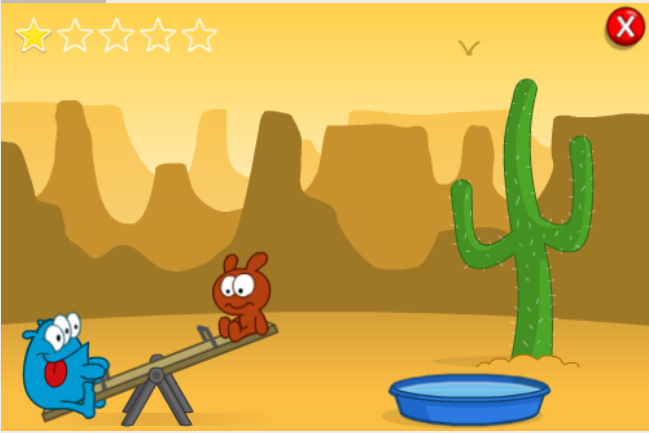 El joc conseisteix en que el personatge de color blau es deixi caure sobre el balanci per tal d’impulsar el personatge de color vermell i es capbusi a la piscina/palangana d’aigua.