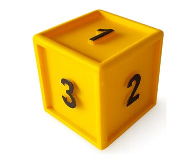 Dau de 6 cares amb números amb relleu de color negre sobre fons groc.