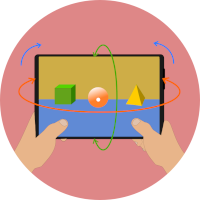 - Formes i Colors (Gyroscope): Aquesta versió, representada amb el logo de l’aplicació amb un fons de color taronja, està pensada per treballar-la sense ulleres de realitat virtual pero mitjançant l’ús del giroscopi. Això es tradueix en que per tal de moure’s per l’espai del joc serà necessari moure el dispositiu de forma física. La idea d’aquesta versió és la de ser apte per aquelles persones amb una baixa motricitat fina però amb mobilitat a les extremitats superiors. Aquesta versió aconsegueix una menor immersió que l’anterior però el fet de combinar l’espai real amb l’espai virtual crea una sensació de immersió durant el procés d’aprenentatge.