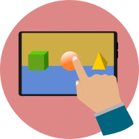 - Formes i Colors (Tàctil): Aquesta versió, representada amb el logo de l’aplicació amb un fons de color verd, està pensada per treballar-la mitjançant el mètode d’interacció tàctil comú en tots els dispositius mòbils. La idea d’aquesta versió és ser apte per aquelles persones que tinguin motricitat fina però una mobilitat limitada a les extremitats superiors. El fet d’utilitzar el dispositiu de forma convencional o damunt d’una superfície redueix molt la sensació immersiva que ofereixen les anteriors versions.