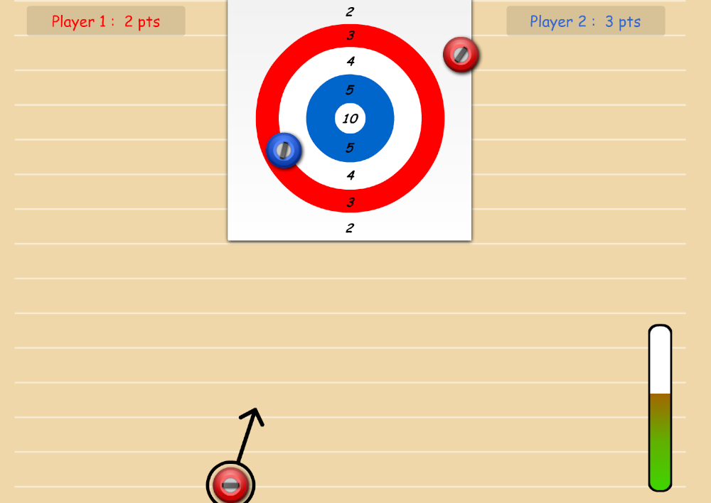 La funcionalitat és molt senzilla: la pedra, objecte amb el qual intentarem fer diana, es mou de forma horitzontal però sempre apuntant cap al centre de la diana un cop premem la barra espaiadora fixarem la direcció i només haurem de tornar a prémer la barra espaiadora per tal de definir la potència amb la qual la volem tirar.