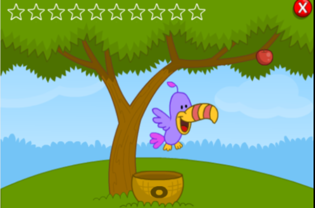 El joc consisteix en que el personatge, en aquest cas un ocell, aconsegueixi recollir les pomes que cauen del arbre i deixar-les dins de la cistella que hi ha al centre del joc.